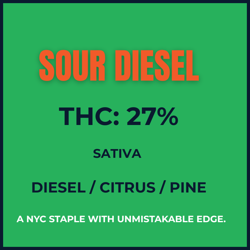Sour Diesel is a legendary strain with deep roots in the city. Known for its pungent diesel aroma accented by citrus and pine, it has earned its place as one of the most recognizable profiles in cannabis history.